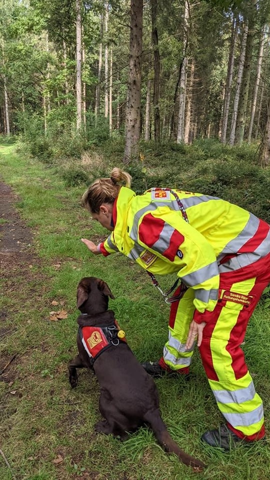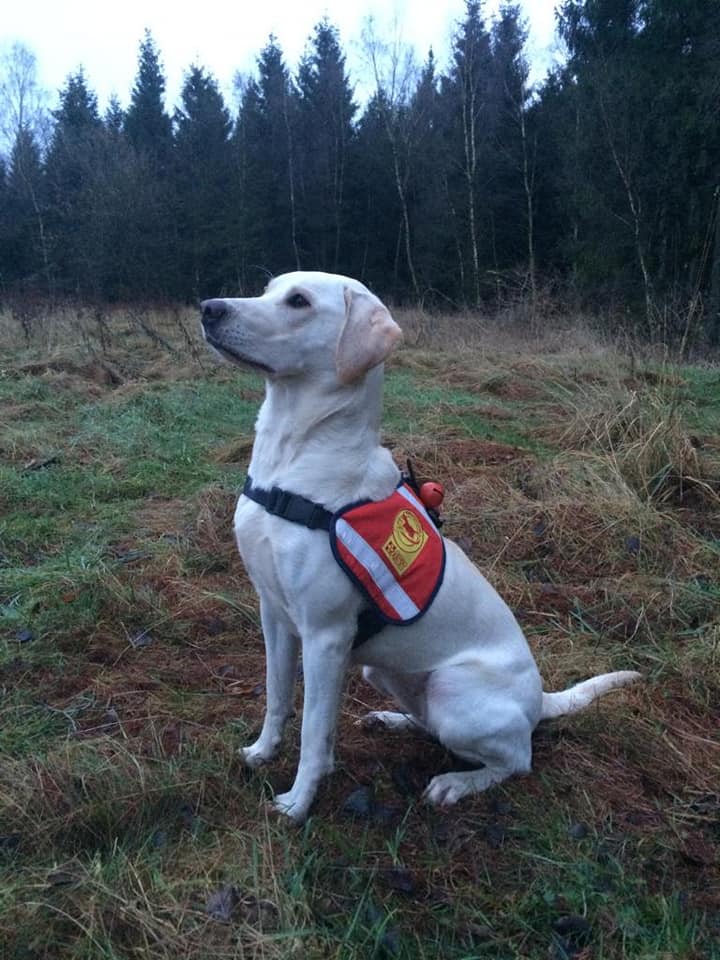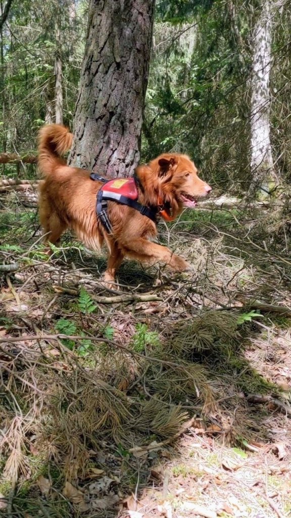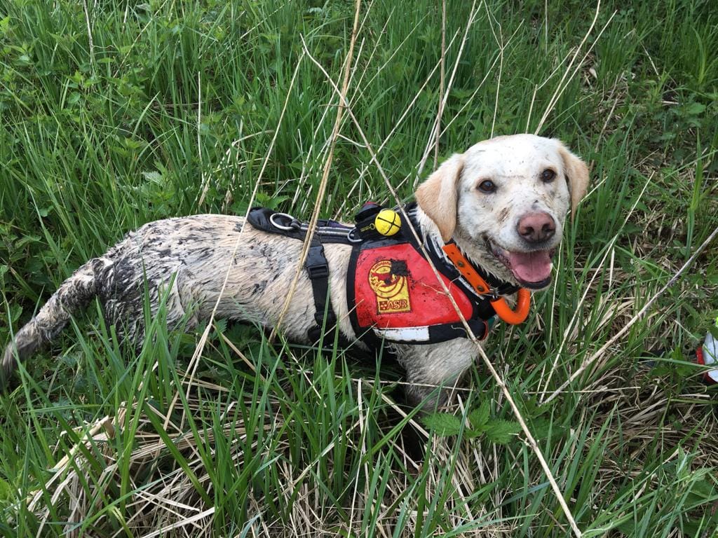 Er hat nun schon dreimal die Rettungshundeprüfung in der Fläche bestanden und sucht nach wie vor begeistert nach versteckten Personen. In der Fläche bringselt er, das heisst, wenn er an der gefundenen Person angekommen ist, bellt er nicht, sondern nimmt sein Schlauch-Halsband (Norweger) auf und läuft damit zurück zu mir. Ich nehme ihn dann an die Leine und er führt mich zum Fundort.
